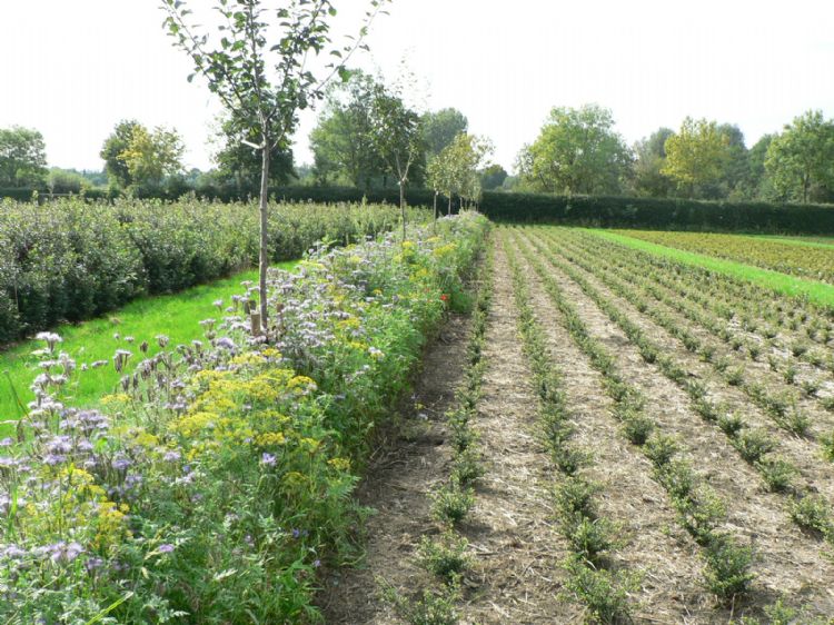 Tussen de plantbedden liggen nog grasgangen. Die worden nu vervangen door gevarieerde en inheemse gras- en kruidenmengsels. Tevens worden er bloemrijke akkerranden ingezaaid en soortenrijke bloemenmengsels gebruikt als groenbemester. De soortenkeuze van deze mengsels zorgt bovendien voor een ideale habitat voor natuurlijke vijanden. "Deze natuurlijke vijanden moeten we absoluut koesteren", zegt Tim Duchêne.