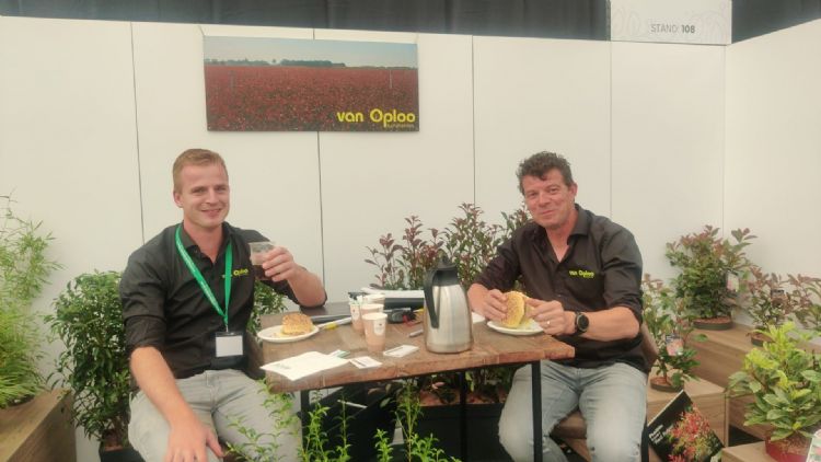 De mannen van Van Oploo Tuinplanten laten het zich smaken. Hun specialiteit is Photonia. Jorg Joossen en Alexander van Oploo.