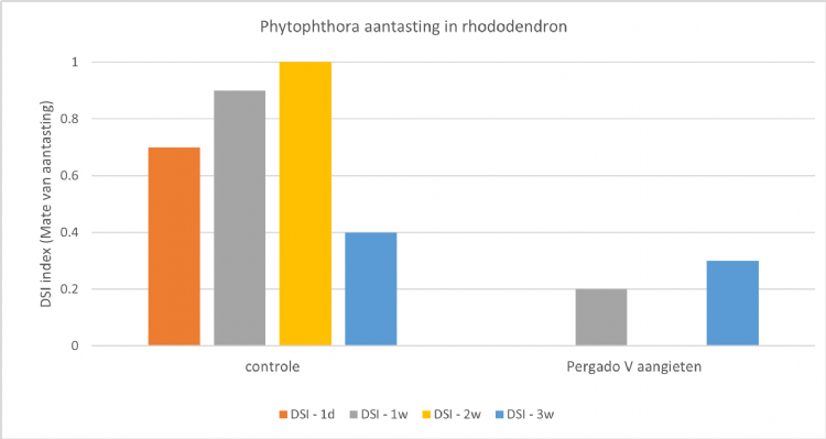 Afgelopen jaar is er een Phytophthora-proef in Rhododendron uitgevoerd door het Proefcentrum voor de Sierteelt (PCS) in Destelbergen (België). In deze proef werd onder andere het middel Pergado V toegepast door middel van aangieten (1,8 L per ha). Pergado V bevat de werkzame stof mandipropamid. Dit middel werkt vooral op sporenvorming en sporenkieming en gaat het binnendringen van de sporen in het blad tegen. In de proef werden de Rhododendron-planten respectievelijk één dag, één week, twee weken en drie weken na de toepassing van Pergado V geïnfecteerd met Phytophthora cinnamomi door mycelium in de potgrond te doen.