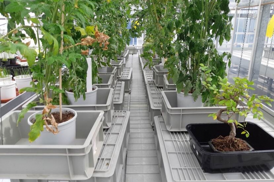 | Proefopstelling tomaten- en Zelkovaplanten per pot in een eb vloed bak (Beeld: ©NVWA) |
