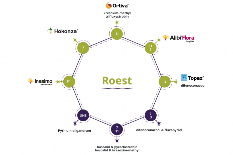 Zo zie je bijvoorbeeld dat een sterk roestproduct als Alibi Flora in de chemische groep 11 en 3 valt. Het is dan niet aan te raden om na een à twee bespuitingen met Alibi Flora vervolgens met Topaz te gaan spuiten, aangezien ze beide in dezelfde chemische groep 3 vallen. Er is dan niet echt sprake van afwisselen. Je kunt dan beter afwisselen met het nieuwe middel Hokonza dat Syngenta recentelijk op de markt heeft gebracht. Hokonza bevat de werkzame stof Solatenol die behoort tot de chemische groep 7 en is dus een goed alternatief om mee af te wisselen. Topaz zou je daarna kunnen inzetten.