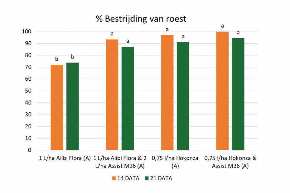 Zowel Alibi Flora als Hokonza geven een zeer goede bestrijding van roest. Toevoeging van de hulpstof Assist M36 zorgt voor een verbeterde opname en lange duurwerking bij Alibi Flora. Hokonza wordt al heel sterk vastgelegd in de waslaag en in het blad en heeft van zichzelf al een lange duurwerking.