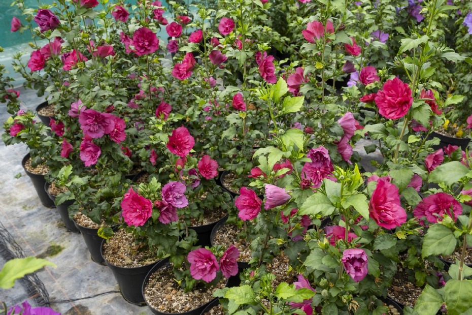 De Hibiscus Chiffon-serie, ingezonden door Boomkwekerij Ronald Roos, Hochberg Nurseries Ltd. en Kordes Jungpflanzen Handels GmbH, heeft een lange bloei met grote, halfgevulde bloemen en opvallende kleuren. Deze hibiscus is geschikt voor vele toepassingen, zoals borders en hagen. Hibiscus syriacus Purple Chiffon ('Rwoods8') heeft donkerrode knoppen die openen tot weelderige paarse bloemen. De Hibiscus syriacus Ruby Chiffon ('Rwoods9'PBR) bezit dezelfde donkerrode knoppen die openen tot warm paarsachtig-rode bloemen. Beide rassen bloeien door tot in de nazomer en zijn geschikt voor solitair gebruik of gemengde hagen.