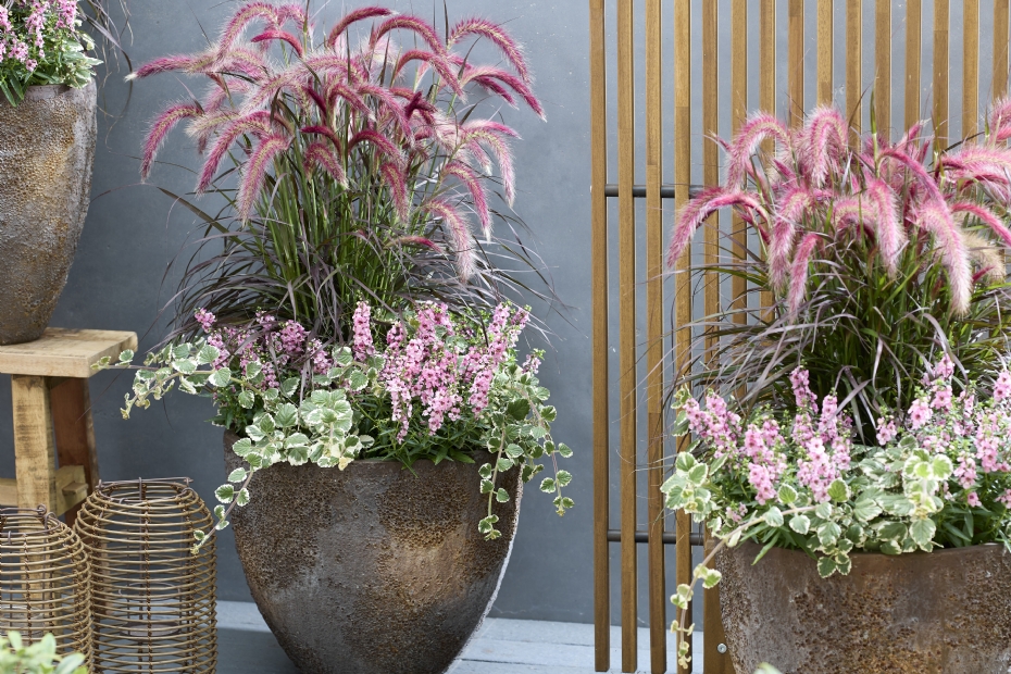 Carex Moon Falls® ('ET CRX 904' PBR), ingezonden door Hoogeveen Plants, valt op met zijn crème-wit met donkergroen gestreepte blad en de overhangende vorm die doet denken aan een waterval. Dit wintergroene siergras zorgt voor structuur, contrast en past goed in potten, borders of hanging baskets. Molinia caerulea 'Banshee' PBR, ingezonden door Cammeraat Potcultuur BV, voegt beweging toe aan beplanting met zijn luchtige pluimen en grijs groene bladtooi die in de herfst koper verkleurt. Passend voor prairiebeplanting of als los siergras in borders. Pennisetum advena Tiny Tails ('TUS022' PBR), ingezonden door Handelskwekerij G. Hoogenraad B.V. en F.N. Kempen vof, is het energieke neefje: laagblijvend, met speelse, borstelvormige bloeiaren die tot diep in het najaar blijven staan. Compact, decoratief en goed te combineren met vaste planten of in potten.