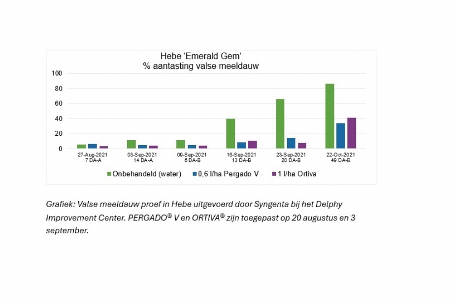 In 2022 heeft Syngenta een proef op valse meeldauw opgezet bij Delphy, waar Pergado V samen met Ortiva in twee toepassingen werd uitgevoerd op 20 augustus en 3 september. In onderstaande grafiek zie je dat 20 dagen na de tweede toepassing bij zowel Pergado V als Ortiva respectievelijk 14 en 7 procent aantasting werd gemeten, ten opzichte van 65 procent aantasting bij onbehandeld gewas.