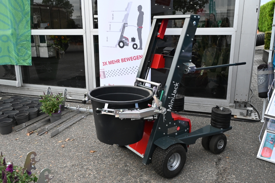 Direct bij de ingang toonde tuin- en parkleverancier Voets een gloednieuwe machine: de MiniJack transportvork, een compacte transportvork van Duitse makelij. Duitse vertegenwoordiger Malte Hamann van Seed2Soil was ook aanwezig om vragen over de nieuwe machine te beantwoorden. Van der Wansem: 'We hebben de MiniJack Transportvork nu één klein jaar in ons assortiment, en de geluiden en aandacht zijn tot nu toe heel goed.' Verder lieten ze ook een nieuwe kleine New Holland trekker zien. De E-Boomer 25 E.