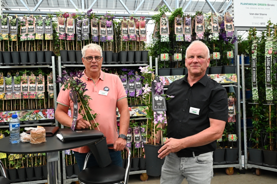 Kwekerij Van der Starre presenteerde verschillende nieuwe klimplanten. Scholte: 'Niet ieder jaar tien nieuwe soorten, maar je moet je klanten toch wel blijven verrassen en je aanbod blijven vernieuwen.' Wat volgens Scholte dit jaar de aandacht trekt zijn de klimrozen, inmiddels heeft Van der Starre zo'n vijftien soorten. Wat het verder goed deed op de beurs waren de door- en rijkbloeiende clematissen.