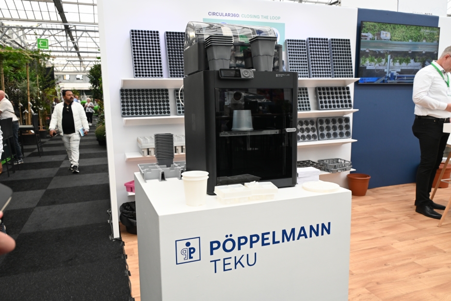 Pöppelmann demonstreerde live 3D-printen van bordjes. Onder het motto Circular 360 - closing the loop zeggen zij met 80 procent gerecycled plastic te werken.