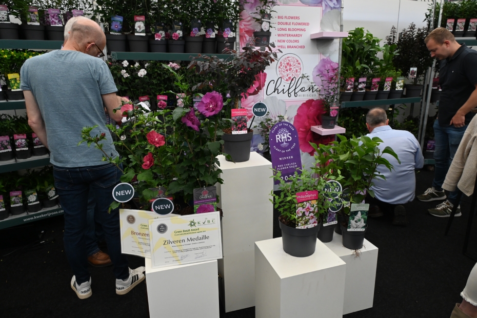 Kwekerij Roos uit Boskoop toonde meerdere prijswinnende planten. Blikvanger was de Philadelphus PETITE PERFUME PINK ('P1') (Plantipp) die eerder dit jaar op de Chelsea Flower Show werd uitgeroepen tot Plant of the Year. Ook verschillende Hibiscus-soorten, waaronder Hibiscus syriacus 'Rwoods8' (PURPLE CHIFFON) en Hibiscus syriacus 'Rwoods9' (RUBY CHIFFON).