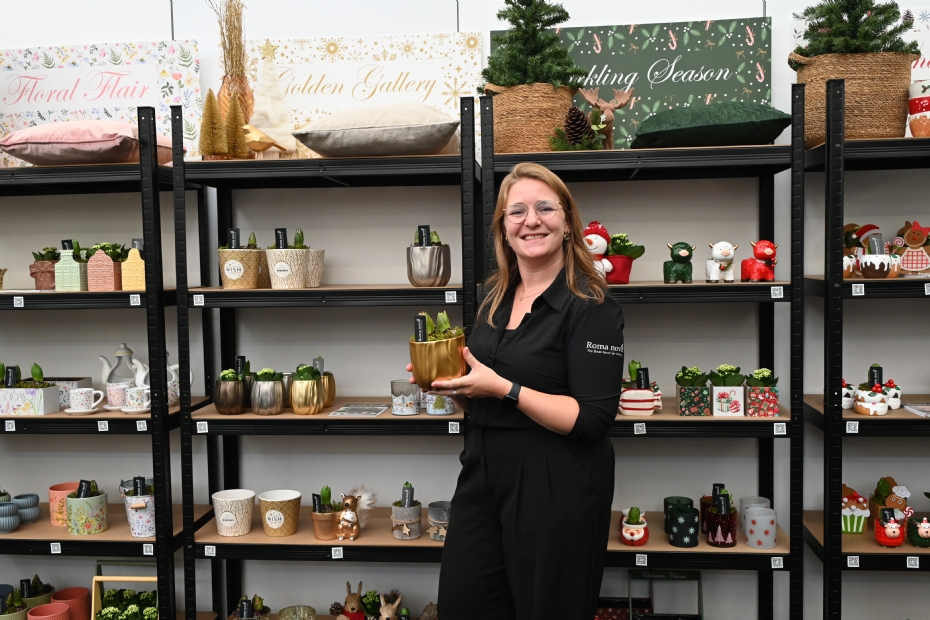 Bij Roma Nova vertelt medewerkster Susan Mooijman dat dit de eerste keer Plantarium|Groen-Direkt is voor de bloembollenkwekerij. De stand springt door de vele kerstaccessoires meteen in het oog. Mooijman: 'We staan hier vooral voor de inkoper. De eerste keer Plantarium|Groen-Direkt bevalt ons goed.'