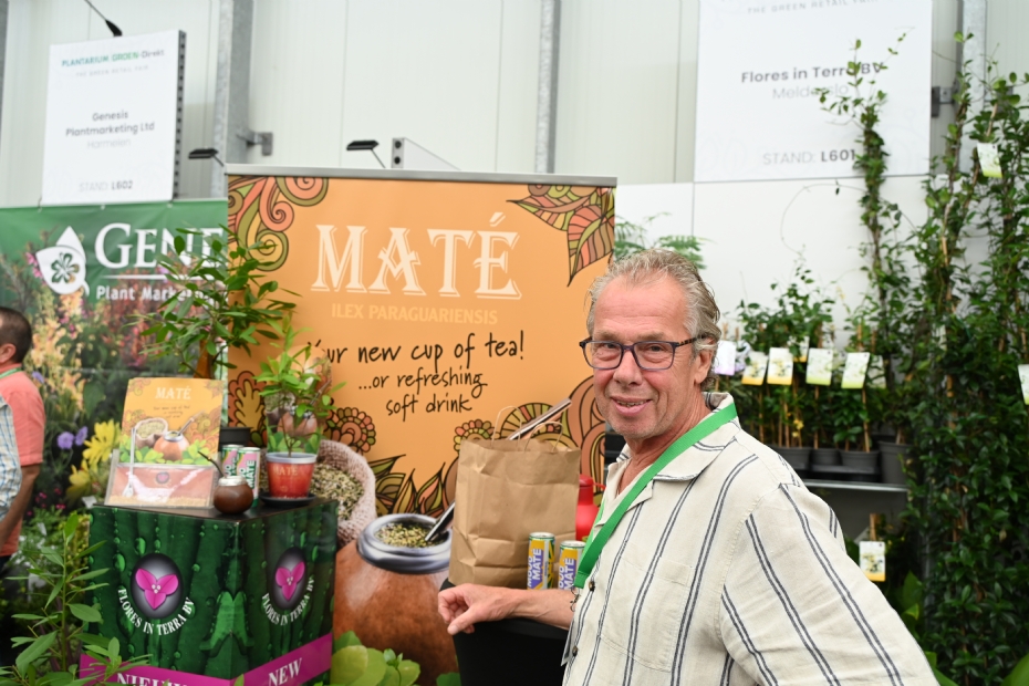Loop je de hoek om naar de laatste beurshal springen de metershoge exoten van Flores in Terra meteen in het oog. De kwekerij en groothandel is gespecialiseerd in exoten en mediterrane planten. Daarnaast presenteren ze ook hun thee Maté, een drankje met veel cafeïne maar weinig suikers. Voor Albrecht Brands van Flores in Terra is Plantarium|Groen-Direkt een relatiebeurs: 'Ik ga hier vooral in gesprek met de klant voor bijvoorbeeld feedback.'
