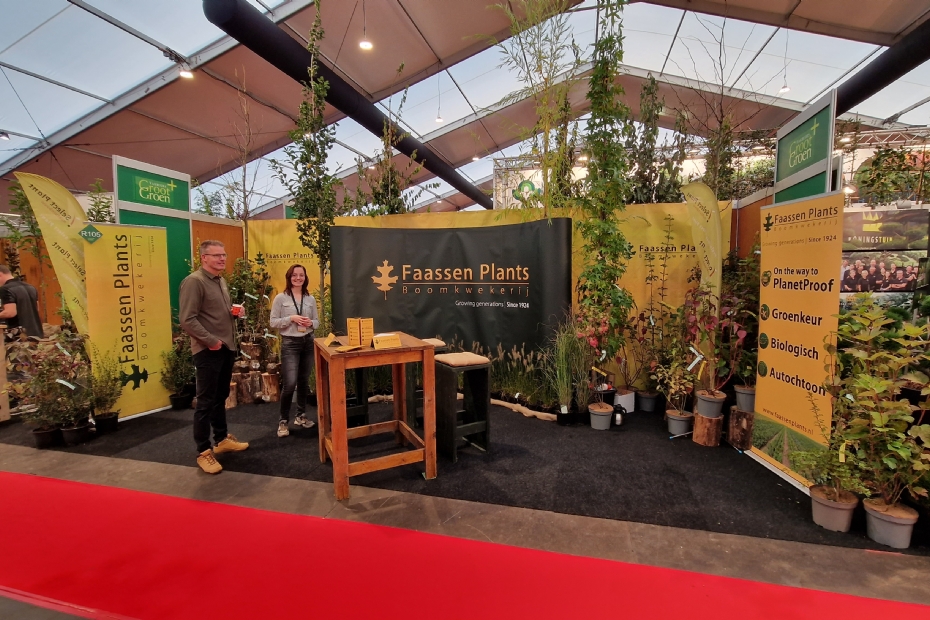 In Zundert laat Faassen een representatieve collectie van zijn bomen en planten zien. 'We kunnen natuurlijk niet alles laten zien. Het belangrijkste is dat we aanwezig zijn en onze naam laten zien. Onze relaties weten ons zeker te vinden. Vorig jaar stonden we er met een partytent met discoverlichting en muziek om ons 100-jarig jubileum te vieren. Dit jaar willen we gewoon herkenbaar zijn in onze stand, onder meer door onze logo's. We brengen de milieucertificaten en het SKAL-label specifiek onder de aandacht, evenals het predicaat Hofleverancier.'