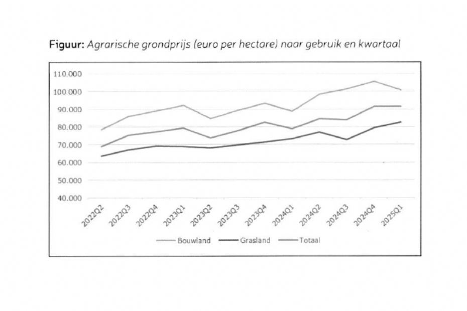 De gemiddelde agrarische grondprijs in Nederland ligt op een hoog niveau en vertoont nog altijd een lichte stijgende lijn. In het eerste kwartaal van 2025 bedroeg de prijs gemiddeld €91.300 per hectare. Dat is 16 procent hoger dan een jaar eerder en fors meer dan de inflatie. Ook de markt voor boomkwekerijgrond blijft onder stevige prijsdruk staan.