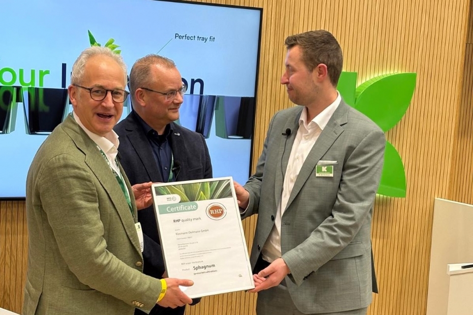 Klasmann-Deilmann heeft als eerste producent een RHP-certificaat ontvangen voor een substraatcomponent op basis van gekweekt sphagnum. Het gaat om Sphaxx, een hernieuwbare grondstof die onder beschermde omstandigheden wordt geteeld. De certificering werd toegekend door RHP en officieel overhandigd tijdens de IPM in Essen.