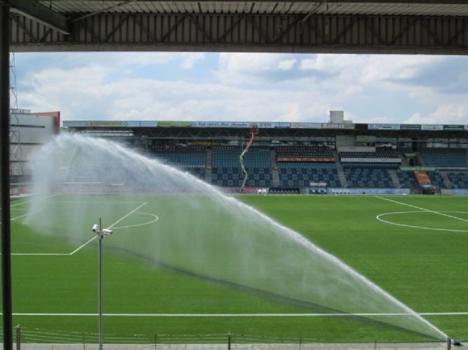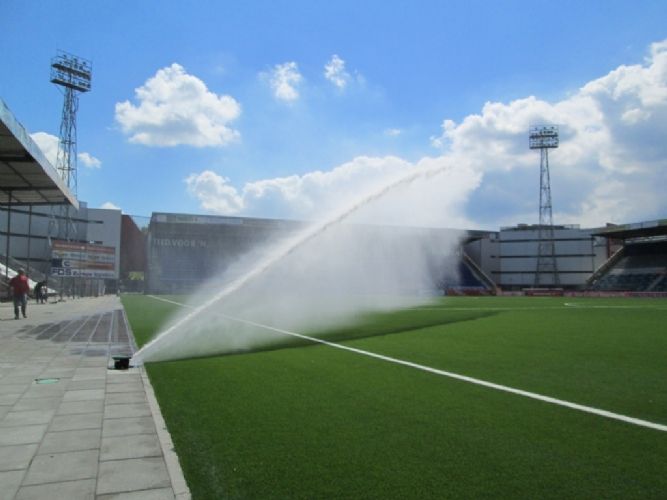 Mölder Sportveldberegening heeft deze opdracht gekregen, omdat ze de afgelopen jaren ervaring hebben opgebouwd met het aanleggen van beregeningsinstallaties, met name voor de wat grotere clubs en clubs uit het betaald voetbal in Nederland. De sproei installaties zijn bij de vijf stadions hetzelfde met als enige verschil de watervoorziening. Dat kan namelijk grondwater, oppervlaktewater of leidingwater zijn. De geïnstalleerde sproeiers werken op alle drie de soorten watervoorzieningen. De vijf clubs uit het betaald voetbal hebben gekozen voor een beregeningsinstallatie, die bestaat uit een aantal speciaal type sproeiers, welke ondergronds staan opgesteld langs de randen van het veld. De sproeiers komen naar boven op het moment dat er voldoende druk op komt, waarna ze sproeien met een effectieve radius van 45 meter, die ook daadwerkelijk gemeten is.