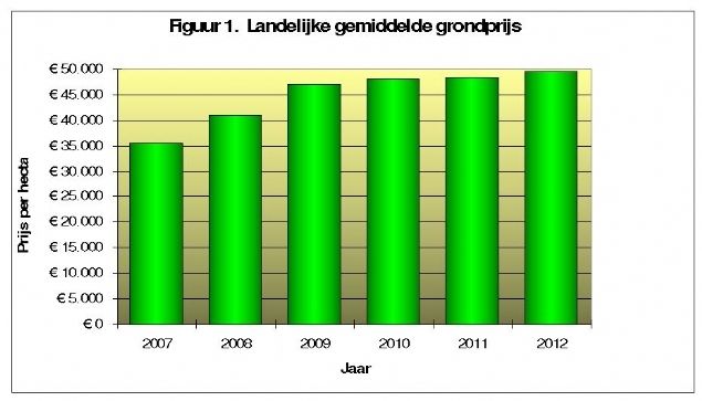 De grondprijzen vertonen nog steeds een stijgende trend, zo blijkt uit de Grondprijsmonitor 2012 van de Dienst Landelijk Gebied (DLG). Tussen 2005 en 2009 steeg de landelijk gemiddelde agrarische grondprijs jaarlijks met gemiddeld 10%. Vanaf 2009 is de gemiddelde stijging 2% per jaar. Ten opzichte van 2011 is de grondprijs in 2012 gestegen met 3%. De grondmobiliteit is ten opzichte van 2011 gelijk gebleven; ruim 1 procent van het areaal landbouwgrond is verhandeld. In tegenstelling tot het landelijke beeld zijn er op regionaal niveau behoorlijke schommelingen in grondprijzen.