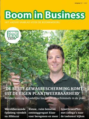 In deze editie van Boom in Business pleit Erwin Maaijen voor samenwerking met de natuur, ook voor een goede opbrengst. Het thema ‘duurzaam’ zien we ook bij het zonne-aggregaat van Agriper, het recyclen van polystyreen trays door Modiform, de verrassende toepassingen van het gewas Miscanthus en de technische en sociale aspecten van het werken met papieren pluggen. Gewasbescherming wordt van diverse kanten belicht, zoals het gebruik van biostimulanten voor plantweerbaarheid en bijzondere spuit- en druppeltechnieken. Ook veel aandacht voor groene middelen, zoals bacteriën en schimmels die schimmels en bacteriën bestrijden. In het Laanboomhuis wordt intussen doorgeboomd over alles wat voor de sector belangrijk is en we kijken alvast vooruit naar de GrootGroenPlus-beurs in oktober. En in augustus is het al tijd voor de frisse start van het samengevoegde Plantarium|Groen-Direkt. Veel leesplezier met deze en nog veel meer interessante verhalen!