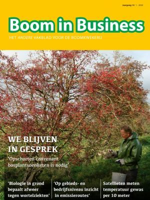 In deze eerste editie van Boom in Business bespreken we duurzame ontwikkelingen in de boomkwekerij, zoals het gebruik van biogisch afbreekbaar boomband, tape en bindbuis, het meten van gewasbeschermingsemissies naar oppervlaktewater in de Moersloot in Zundert en de toenemende focus op groene middelen bij BASF. We zien hoe data een belangrijke rol kunnen spelen op de kwekerij met IrriWatch met Aquafeed en doen samen met Lensli en Kekkilä-BVB de nodige ervaring op met veenarme substraten en hernieuwbare grondstoffen. Ook ontdekken we wat er komt kijken bij de veredeling van Prunussen met Adrian Straver, Basrijs verlicht het zware werk met vernuftige rooiers, terwijl Rovero veelzijdige cabriokassen bouwt. Intussen zijn verschillende sectorpartijen met elkaar in gesprek over het vlottrekken van de ‘zadenwinkel’ in het kader van de Nederlandse Bossenstrategie. Tot slot zet Pius Floris ons met beide benen op, of liever in de grond, want het is niet de grond zelf, maar de biologie ín de grond die zorgt voor een betere weerbaarheid. Lees dit en meer in de nieuwe Boom in Business.