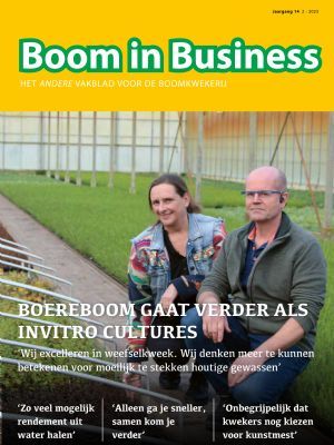 Maak je borst maar nat als je deze tweede editie van Boom in Business openslaat, want de nattigheid vliegt je om de oren in het themanummer over watermanagement. We dwalen door de mist van Agricult die de wortels van plantgoed vochtig houdt, duiken met Telermaat in de kwaliteit van het water en halen met Netafim alles uit een druppel. Toch bewaren we met Broere water voor later in de ondergrondse opslag. Verder lezen we over de aansluiting van de Midden-Brabantse regio bij Treeport Zundert, de nieuwe Limburgse tak van de Brancheopleiding Boomkwekerij en krijgt de Camellia Femme Fatale bij Snepvangers een plek in de schijnwerpers. Ook vindt Gebr. Ezendam het (elektrisch aangedreven) wiel uit. Lees dit en nog veel meer in de nieuwste Boom in Business!